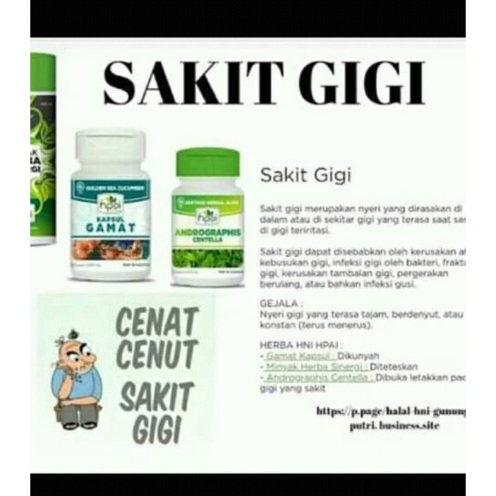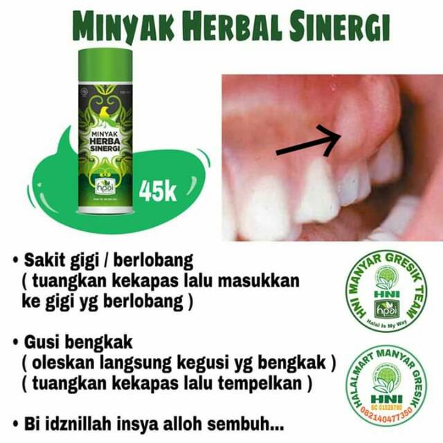 Untuk itu harus dicarikan cara mengobati sakit gigi agar tidak berkelanjutan. Minyak oles untuk bayi batuk pilek wa: 085 71 72 73 115. Obat herbal sakit gigi hni hpai. Beli minyak herba sinergi minyak butbut serbaguna untuk urut stroke patah tulang sakit gigi diare.